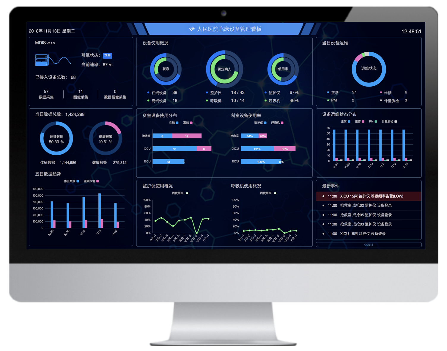 實時顯示數據引擎狀態,數據趨勢、設備使用概況、科室品牌設分布和使用概況、設備運維狀態、最新運行事件的可視化數據大屏